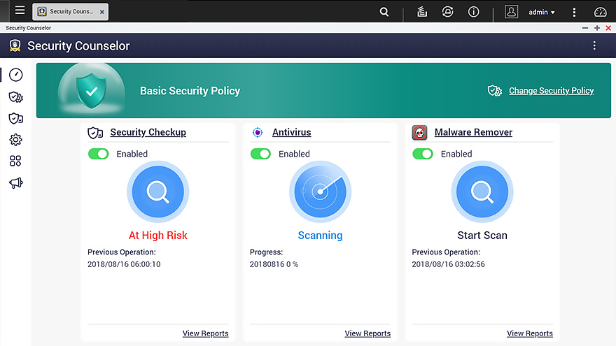 Notification Center (通知中心) 将系统及所有应用状态通知整合于单一应用中,让您一次管理众多应用通知设定,随时掌握 NAS 的状态。而 Security Counselor (安全评估中心) 可为 TS-1253DU-RP 评估安全性设定,提升 NAS 的环境安全。
